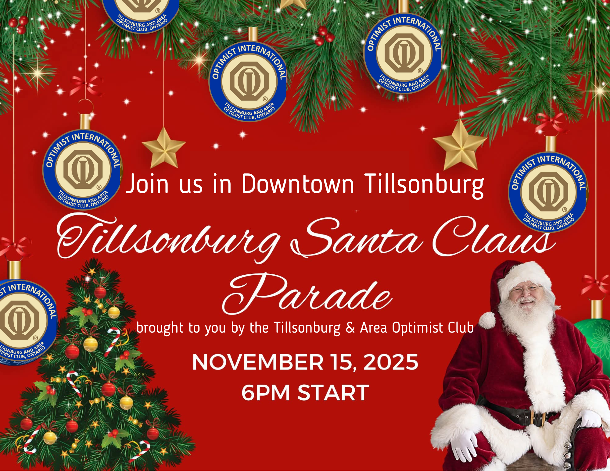 The Tillsonburg Santa Claus Parade, brought to you by the Tillsonburg & Area Optimist Club, will take place on November 15 in Downtown Tillsonburg.
